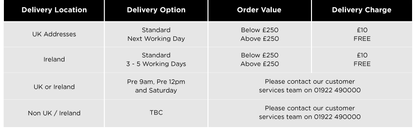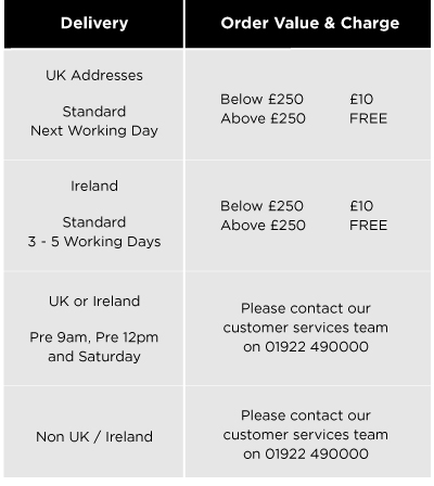 Please see delivery table for all delivery charges. We are unable to accept orders online that do not have a UK postal address or Ireland address for delivery. If your delivery address is an Ireland address, it is your responsibility to select this in the delivery options. Selecting the incorrect delivery option may incur additional charges and a delay in your order. If you do not have a UK or Irish postal address, please contact the sales office for alternative options for order and delivery: 01922 490000.